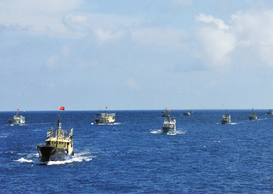 7月15日,渔船船队行进在距离永暑礁高脚屋34海里的海域上。 新华社记者 王存福 摄