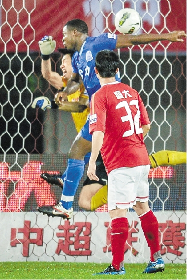 15日,在2012年中超联赛第17轮比赛中,广州富力队客场以1比0战胜广州恒大队,实现了本赛季对恒大的双杀。图为广州富力队球员雅库布(中)头球攻门得分。 新华社发
