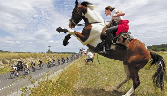 14日,在环法自行车赛第13赛段比赛中,比利时乐透车队的德国车手格雷佩尔夺得赛段冠军,天空车队的英国车手维金斯继续保有黄色领骑衫。图为一名女观众骑着马在赛道边观看比赛。 新华社发