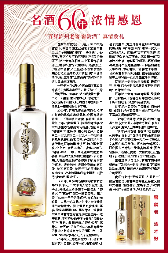 60年来,在党的亲切关怀下,创新卓越的泸州老窖人团结一致、锐意进取,创造了完整的、真正具有自主知识产权的民族品牌,将“中国名酒”精神一次又一次发扬光大。这就是“百年泸州老窖 窖龄酒”肩负的光荣使命。正如每一瓶“百年泸州老窖 窖龄酒”的瓶底,都镂刻着熠熠生辉的五角星图案、以鲜艳的颜色交相映衬,象征着泸州老窖数十年如一日沐浴着党的阳光雨露、在中国白酒发展史上书写的一页页浓墨重彩的诗篇。