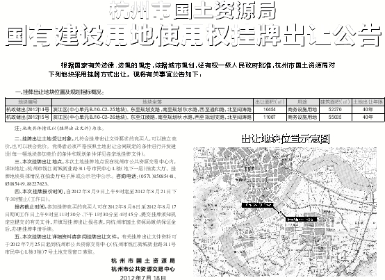 五、本次挂牌出让详细资料请参阅挂牌出让文件。有关挂牌出让文件资料可于2012年7月25日起到杭州市公共资源交易中心(杭州市钱江新城新业路311号市民中心L楼3楼)7号土地交易窗口索取。