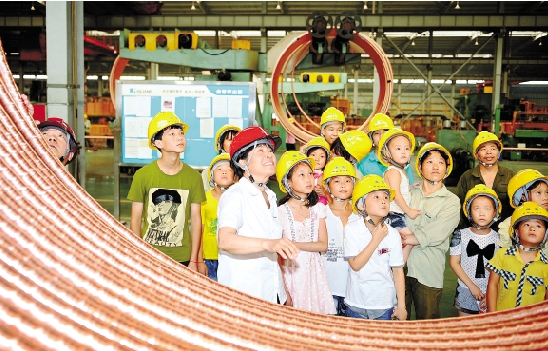 7月18日,来自四川、河南、贵州等地的外来建设者子女,走进诸暨市浙江海亮股份有限公司盘管事业部生产车间,参观他们父母的工作岗位,体会父母在这里创业的情景。