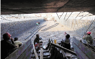 温州七都大桥建设工地,工人们在阴凉处补充水分。 陈晓彬 摄