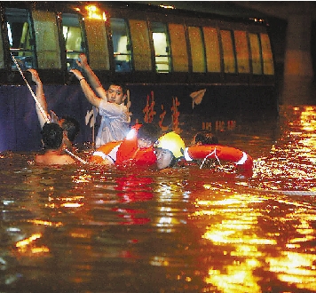 北京莲花桥,消防队员和志愿者营救被困公交乘客。 新华社发
