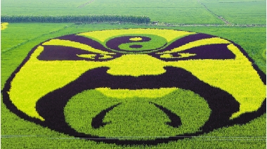 图为京剧脸谱图案的稻田画(7月21日摄)。位于沈阳市沈北新区兴隆台街道、黄家街道农田里的稻田画项目吸引了众多游客。这些稻田画包括七星龙腾、京剧脸谱等15幅图案,由紫色、黄色、绿色三种彩色水稻组成。 新华社记者 杨青 摄