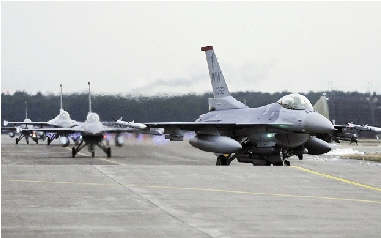 美国驻日本三泽空军基地一名发言人22日说,一架美军F-16型战机当天在北海道根室市附近的太平洋海域坠落。飞行员弹射出舱,等待救援。目前暂不清楚战机的坠落原因。这张由美国空军拍摄,并由日本时事通讯社提供的照片显示,2011年12月,美军的F-16型战机在日本三泽空军基地等待起飞。 新华社发 |