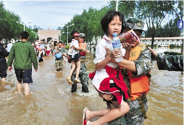7月22日,被困人员在救援人员的帮助下撤离北京市房山区青龙湖中国少年军校基地。 新华社记者 李文 摄