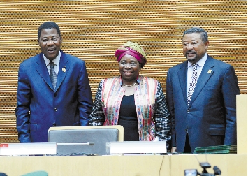 7月16日,在埃塞俄比亚首都亚的斯亚贝巴举行的第19届非洲联盟(非盟)首脑会议闭幕式上,南非内政部长德拉米尼·祖马(中)与卸任的非盟委员会主席让·平(右)和非盟轮值主席、贝宁总统亚伊合影。 新华社发