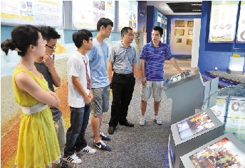 刘诚刚(右一)为大学生们介绍中国深海勘探的情况。 嵇敏 摄