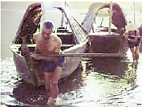 大坝蓄水、石浦船帮解散前,船工拉纤上滩的影像。