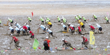 7月23日,岱山县秀山岛第八届海泥狂欢节开幕,滩涂上上演了速滑、抓鸭、搬轮胎等趣味运动。 沈磊 摄