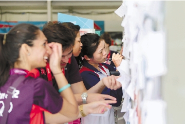 在伦敦奥运村,运动员和志愿者写下自己祝福,贴在卖纪念品商店的墙上。