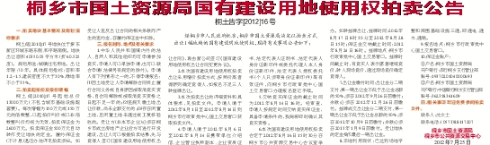 桐乡市国土资源局国有建设用地使用权拍卖公告