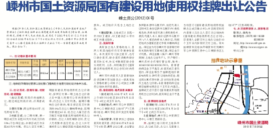 根据《中华人民共和国土地管理法》、《中华人民共和国城市房地产管理法》、《招标拍卖挂牌出让国有建设用地使用权规定》等法律、法规的规定,经嵊州市人民政府批准,我局定于2012年8月15日上午8时30分始至2012年8月24日下午4时止的工作日内,在嵊州市公共资源交易中心三楼交易服务区以挂牌方式出让下列一宗国有建设用地使用权。现公告如下: