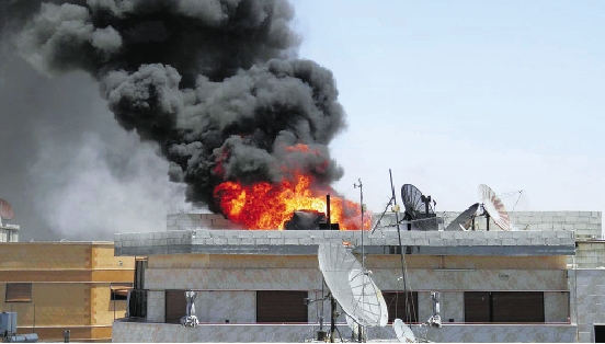这张由当地媒体《沙姆报》提供的照片显示,叙利亚霍姆斯省哈利迪耶的一座建筑7月23日发生爆炸并起火。 新华社发