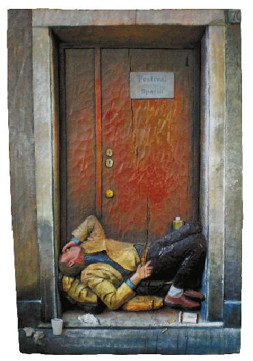 | 一眼(浮雕) 缪声远 作 在人往高处走的时代里,谁回眸了社会底层?这是作者在意大利翡冷翠看到的街角一景,宁静,却揪心。饮料罐和身下的毛毯是他所有家当,而身后那扇门却不是他的家。她用木雕刀一凿一凿地敲打,再用重彩上色,将这个浮在社会尘埃里的生命之轻,深深地刻在观众眼里。 《一眼》是6件系列作品之一。选用金丝柚木材质,用浮雕的形式,巧妙利用木雕板外形与画面中的门框形成双层禁锢,所有景物陷在仅8厘米厚度的浮雕板中,营造局促的生命空间。对浮雕与色彩结合的研究,是当代浮雕创作中新的探索,以雕塑质感为本,增强浅浮雕的色彩空间。作品参加了《启》中国青年雕塑家全国巡展,现藏北京今日美术馆。 (陈炼) |