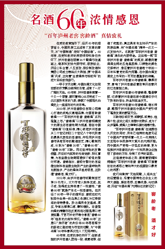 60年来,在党的亲切关怀下,创新卓越的泸州老窖人团结一致、锐意进取,创造了完整的、真正具有自主知识产权的民族品牌,将“中国名酒”精神一次又一次发扬光大。这就是“百年泸州老窖 窖龄酒”肩负的光荣使命。正如每一瓶“百年泸州老窖 窖龄酒”的瓶底,都镂刻着熠熠生辉的五角星图案、以鲜艳的颜色交相映衬,象征着泸州老窖数十年如一日沐浴着党的阳光雨露、在中国白酒发展史上书写的一页页浓墨重彩的诗篇。
