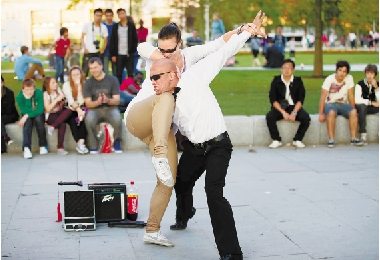 街头艺人(右)配合游客摆出各种姿势吸引了很多游客拍照留影。