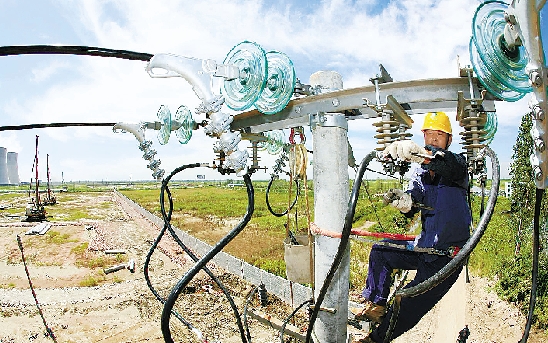 7月26日,绍兴柯桥供电分局“电力青年突击队”队员冒着高温,为滨海印染产业集聚区新建10千伏供电线路,保障60多家入驻企业厂房建设的电力供应。 绍兴县报记者 高洁 摄