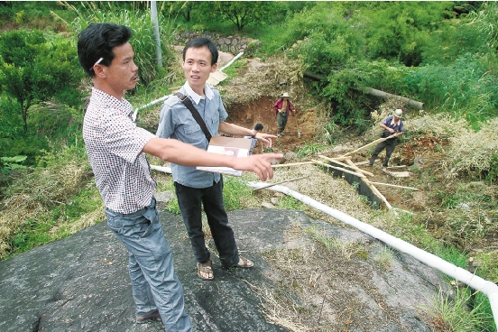在塘底村上张自然村,常山县委组织部的徐健春(左二)向村民询问驻村干部李斌的表现。
