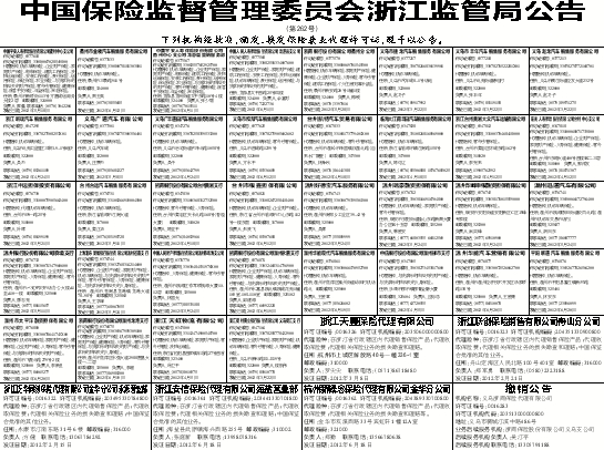 代理险种:在浙江省行政辖区内代理销售保险产品;代理收取保险费;代理相关保险业务的损失勘查和理赔等。