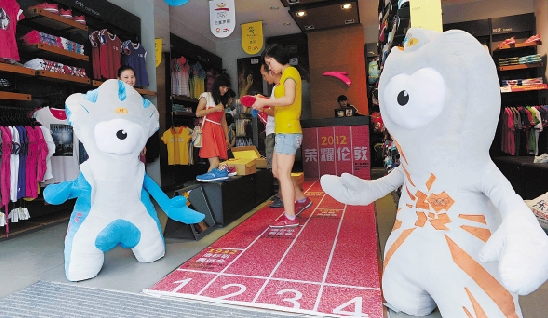 伦敦奥运会即将开幕,杭城商家纷抓奥运商机。7月26日,杭城一家奥运产品特许经销店在门口摆放出伦敦奥运会吉祥物文洛克和曼德维尔。 本报记者 董旭明 摄