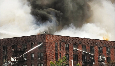 7月26日,在美国纽约布鲁克林区,消防人员在为一栋住宅楼灭火。当天,纽约布鲁克林区的一栋七层的住宅楼发生火灾,目前已造成14人受伤。这栋住宅楼共有115套公寓。 新华社发