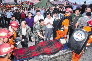 7月29日,救援人员抬着5名被困矿工走出矿井。 当日,经不懈的抢险救援,贵州普安县安利来煤矿冒顶事故5名被困矿工全部脱险。他们在井下被困96个多小时后,于29日19时20分左右安全升井,随后迅速被送往黔西南州人民医院作进一步检查。据介绍,这5名矿工身体状态良好,无外伤。 新华社发(赵兴 摄) |