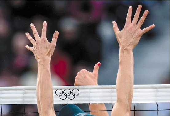 7月29日,奥运会沙滩排球小组赛的选手在球网上争夺,恰巧形成好象夸奖对方拦网的手势。