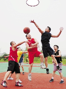 下班后,陈晓军(右二)与几位球友相约来到公司篮球场打球。目前,公司本部建设了两个灯光塑胶篮球场、两个羽毛球场、一个网球场,供员工们免费使用。