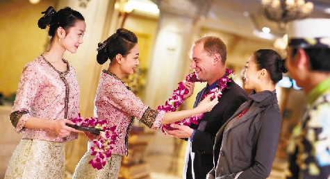 个性化的专业服务,是会奖型酒店“优秀”与“平庸”之间的一条分水岭。有特色,有个性,以顾客为导向的酒店往往受到人们的欢迎。杭州第一世界大酒店经过严格培训,推出了“四师”服务。所谓的“四师”就是礼仪师、高级宴会服务师、花艺师和美工师。“四师”队伍的组建都是经过层层选拔和培养,由酒店最为优秀专业技术骨干组成,以确保在会议期间提供极致的个性化特色服务。比如说,礼仪师从服饰到配饰都是清一色的泰式风格打扮,与其他酒店的礼宾队伍的穿着上有明显的区别,简单而熟悉的纯泰式的“双手合什礼”以及“萨瓦迪卡”礼貌语显得特别有亲和力。高级宴会师的“出菜秀”受过专业指导,形式优雅出人意料。