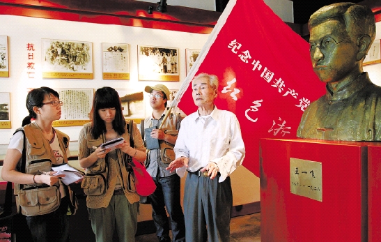 上虞市丰惠镇,老同志讲述王一飞烈士的故事。 何颖 摄