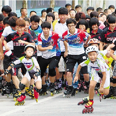 8月23日,2012世界自由式轮滑锦标赛在丽水拉开战幕。图为刷街活动轮滑爱好者出发。 雷宁 摄