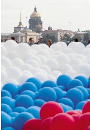 8月22日,在俄罗斯圣彼得堡涅瓦河畔,人们用气球组成俄罗斯国旗图案。当日是俄罗斯国旗日,俄罗斯许多地方都举办了庆祝国旗日的活动。