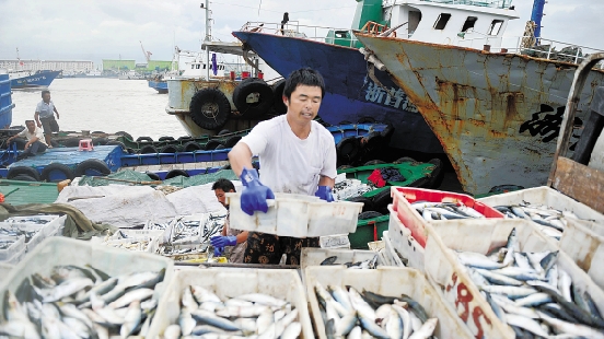 8月25日,舟山市2000多艘渔船陆续回港避风,各渔港码头卸货繁忙。
