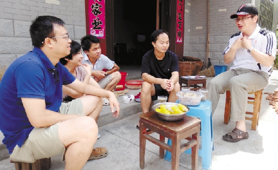 晒谷场上,郭教授和投农大学生在交流。从左到右依次为李小军、邓国芳、杜正伟、张芳国和郭红东教授。 蒋蕴 摄