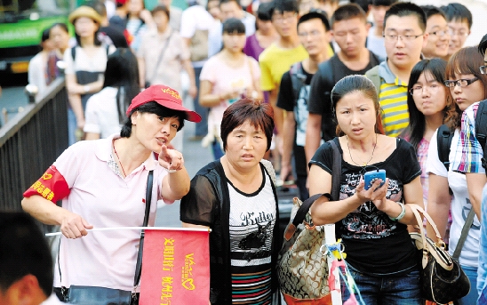杭州公交总公司第二汽车分公司170多名党员放弃休息,为游客指路。 记者 吴元峰 摄