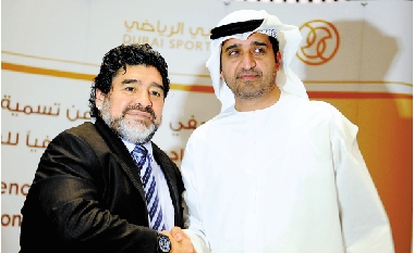 9月2日,马拉多纳与迪拜体育委员会签署正式协议,成为迪拜市体育荣誉大使。根据这一协议,到2013年8月底以前,马拉多纳将以迪拜体育荣誉大使身份开展工作,向迪拜提供他在发展足球方面的专业知识,并随迪拜代表团参与阿联酋国内和国际上各种体育会议,见证迪拜体育的发展和未来。图为马拉多纳(左)在新闻发布会上。 新华社发 |