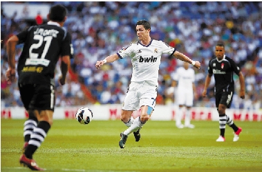 9月2日,皇马队球员C罗(中)在比赛中传球。当日,在西班牙足球甲级联赛第三轮比赛中,皇家马德里队主场以3比0战胜格拉纳达队。这也是球队在新赛季西甲的首场胜利。 新华社发
