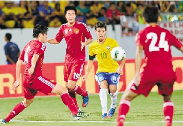 本场比赛,巴西队多变的节奏让中国队员非常难以适应。 新华社发