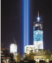 9月10日,在美国纽约曼哈顿世贸中心遗址,两根象征着原世贸中心大楼的光柱照向空中。