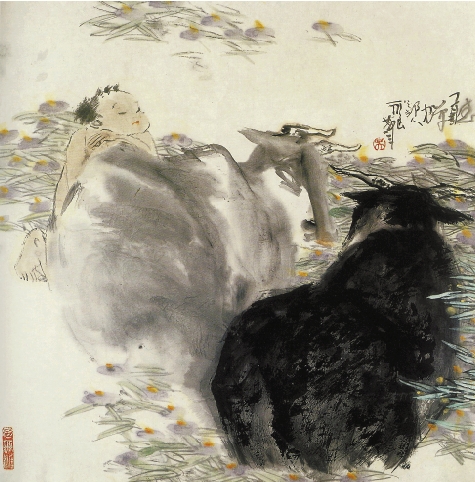 | “浙派人物画”的特点,是精准、概括、传神的造型能力,和中国传统绘画“骨法用笔,墨分五彩”艺术表现的继承。所以,浙派人物画中,既有能展现和诠释时代的主题创作,又不乏意趣横生的艺术小品。吴永良的《听蝉》就是这样一幅生活气息浓郁、情调清雅的作品,描绘的是江南儿童放牧听蝉、悠游嬉戏的情景。画面主体部分是两头牛的背影,一黑、一灰色调呼应,形体稍加勾勒,主要以水墨晕染表现牛的身躯,简略而团块分量厚重,牛的四肢与牧童皆隐没于繁茂的花海、草木之中,展现了江南夏日田畴间草木连天风情。画家融情于笔墨,通过概括平凡生活中的美,展现了清新妙趣的诗情。 (潘欣信) |