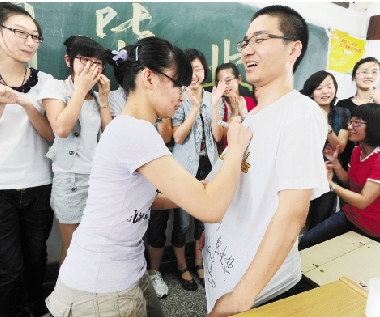 上虞中学高三(2)班的学生在班主任老师的T恤上签名祝福,感谢老师多年的教诲。 韩坚 摄