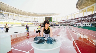 农运会田径比赛“农”味很足。抛掷秧苗、收粮进仓等都富含农村气息,充满趣味。图为9月20日来自我省文成县的运动员刘琪琪在参加女子5分钟50米抗旱提水保苗赛跑。 记者 方海 通讯员 叶敏 摄
