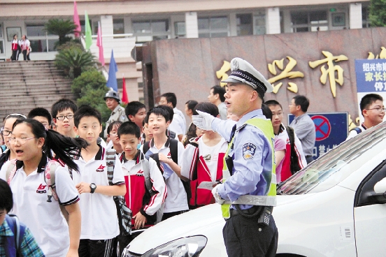 图为绍兴市第一初级中学龙山校区门前民警在引导学生过马路。金敖生 摄