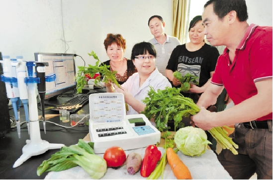 9月20日,诸暨市马剑镇农产品质量安全检测中心工作人员在检测蔬菜。目前,马剑镇将检测中心搬入农贸市场,方便居民和经营户随时检测。 徐德文 倪钰 摄