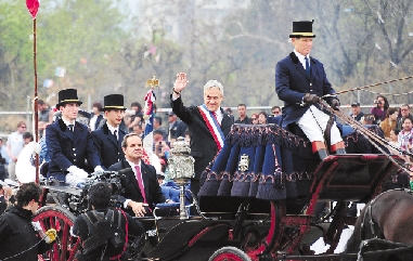 9月19日,智利总统皮涅拉(中)在首都圣地亚哥出席阅兵仪式,庆祝智利独立202周年。 新华社发