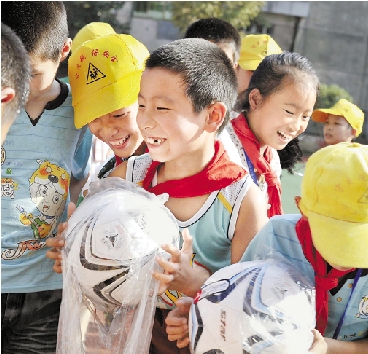 孩子们拿到了捐赠的体育器材,高兴的合不拢嘴。 陈熙春 摄