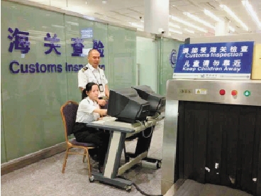 丁骁敏(右)和同事正在进行查验工作。 唐邢 摄