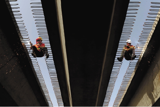 来自金华、兰溪的电焊工张成、孙小坡正在高速路桥上工作。
